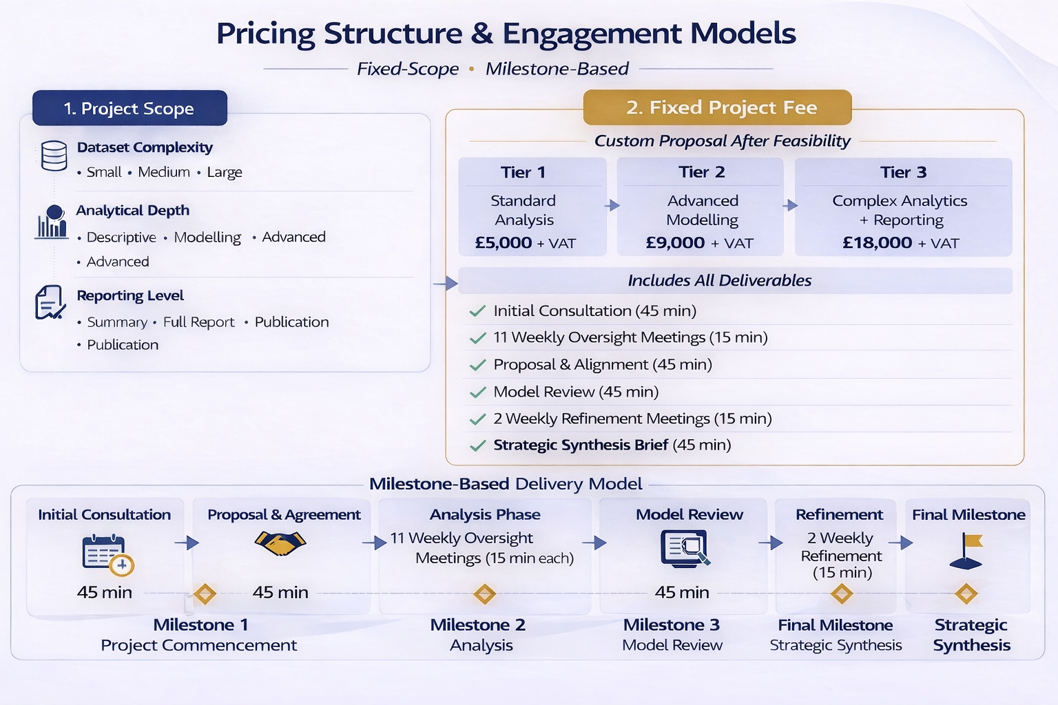 All tiers follow the structured CRISP-DM 16-week cycle, including weekly Analytical Alignment Briefs and secure OneDrive/MFA hosting.
