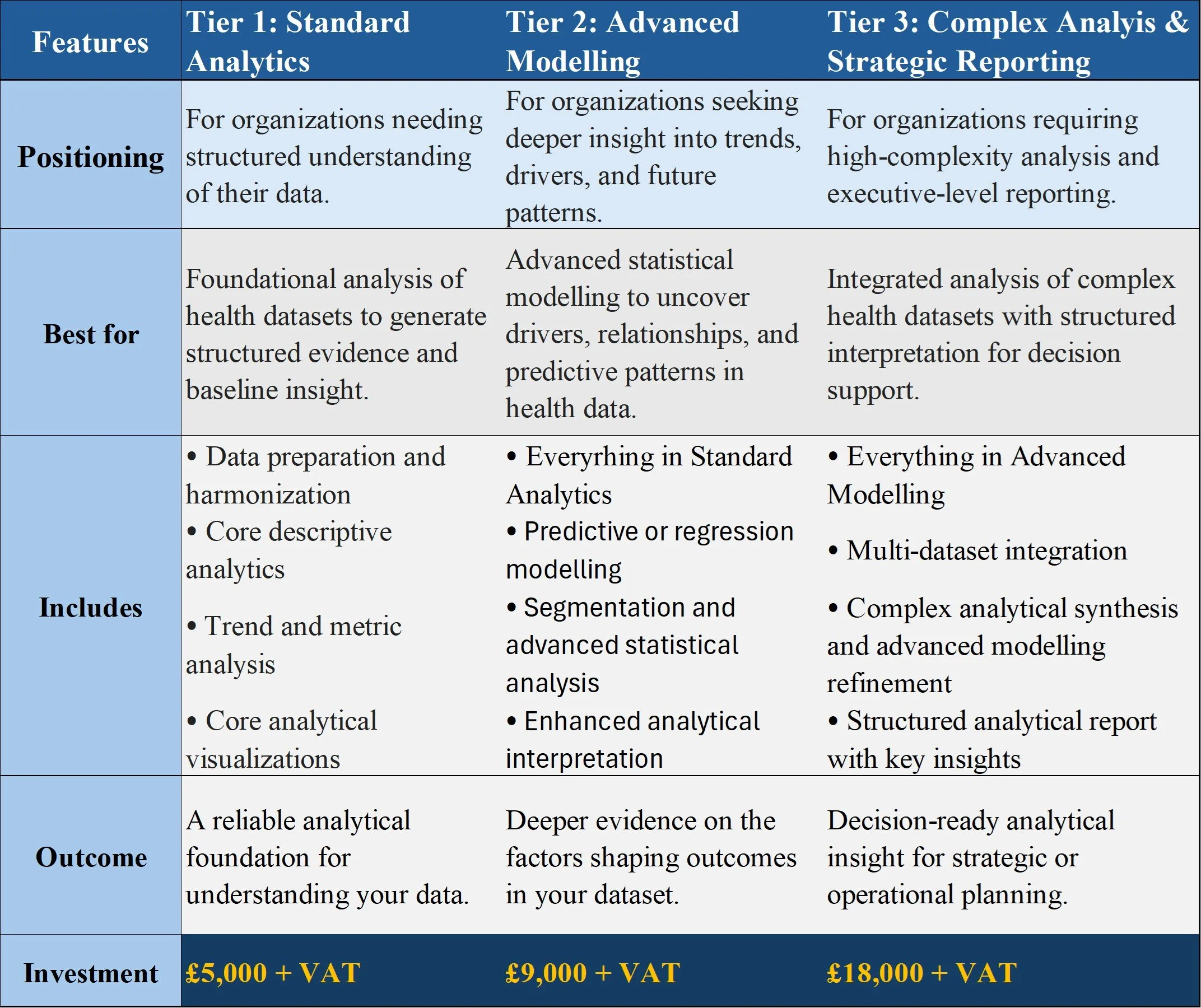 Each tier represents a different level of analytical depth and statistical leadership applied during the same structured 16-week engagement period.