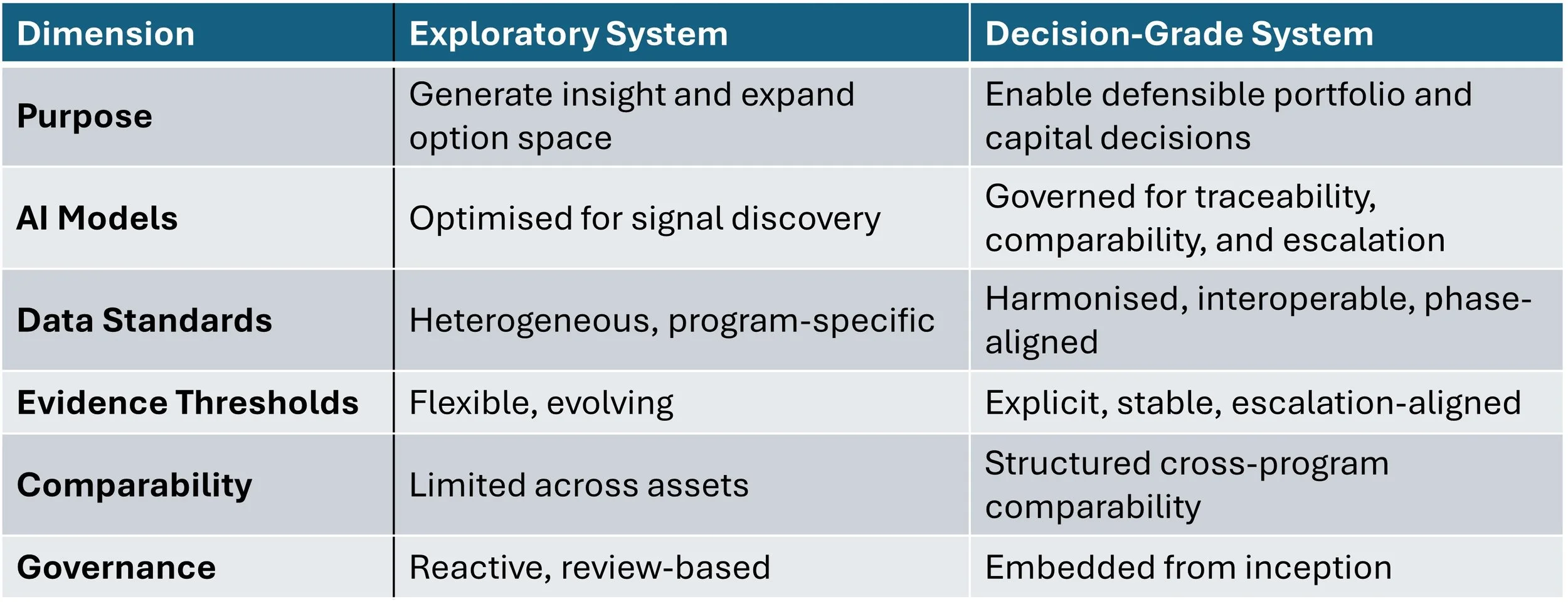 Leaders overlook this layer because each component appears in isolation i.e. Discovery produces signals, Data science builds models, Clinical teams run trials, Governance committees review progress. The structural weakness only becomes visible when insight must withstand scrutiny (regulatory, financial, or strategic). By then, capital has already been committed.